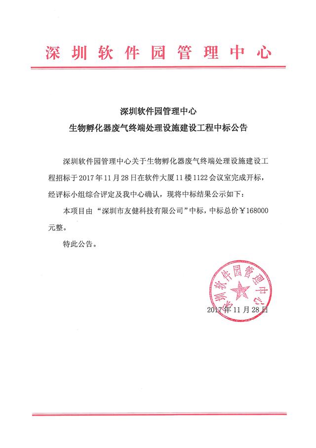 深圳生物孵化器废气终端处理设施建设工程中标公告