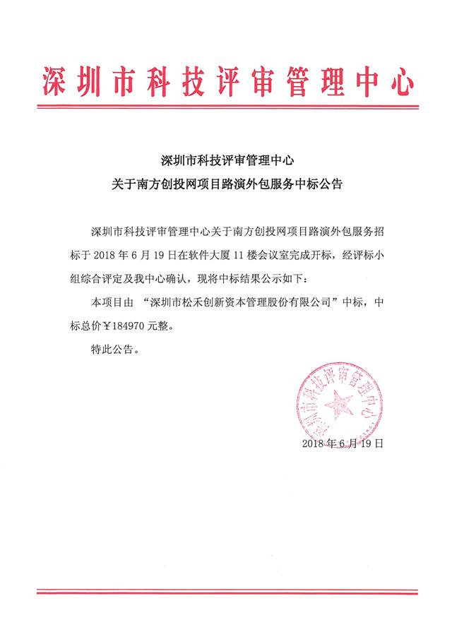 深圳市科技评审管理中心关于南方创投网项目路演外包服务中标公告