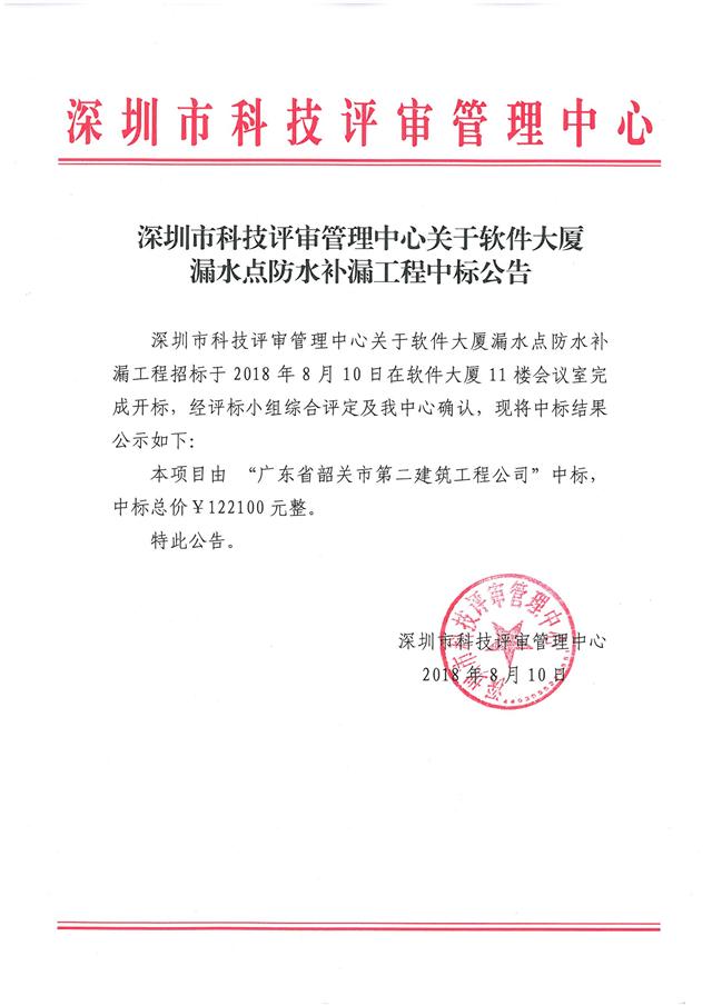 深圳市科技评审管理中心关于软件大厦漏水点防水补漏工程中标公告