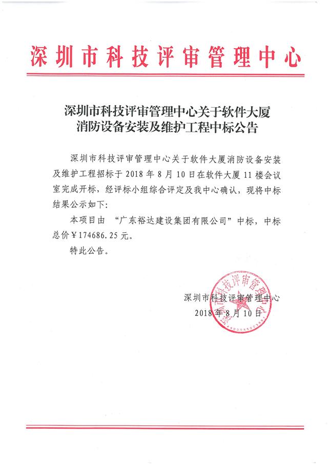 深圳市科技评审管理中心关于软件大厦消防设备安装及维护工程中标公告