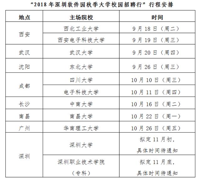 深圳软件园隶属于深圳市科技创新委员会,是国家科技部认定的国家火炬计划软件产业基地,2017年园区总收入8809 亿元,从业总人数达43万余人。一直以来,深圳软件园与教育部国家示范性软件及计算机等学院保持着紧密的合作。为增强深圳科技企业人才竞争实力,帮助企业招聘全国优秀大学毕业生,“2018年深圳软件园秋季大学校园招聘行”正式启动。深圳软件园将组织企业到西安、成都、武汉、沈阳、南昌、长沙、广州等多所高校进行集中招聘。请全市科技相关企业积极参加。此次校园招聘行程安排如下: