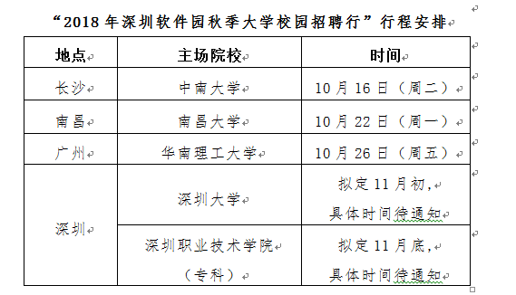 深圳软件园隶属于深圳市科技创新委员会,是国家科技部认定的国家火炬计划软件产业基地。一直以来,深圳软件园与教育部国家示范性软件及计算机等学院保持着紧密的合作。为增强深圳科技企业人才竞争实力,帮助企业招聘全国优秀大学毕业生,“2018年深圳软件园秋季大学校园招聘行”正式启动。深圳软件园将组织企业到南昌、长沙、广州、深圳多所高校进行集中招聘。请全市科技相关企业积极参加。此次校园招聘行程安排如下: