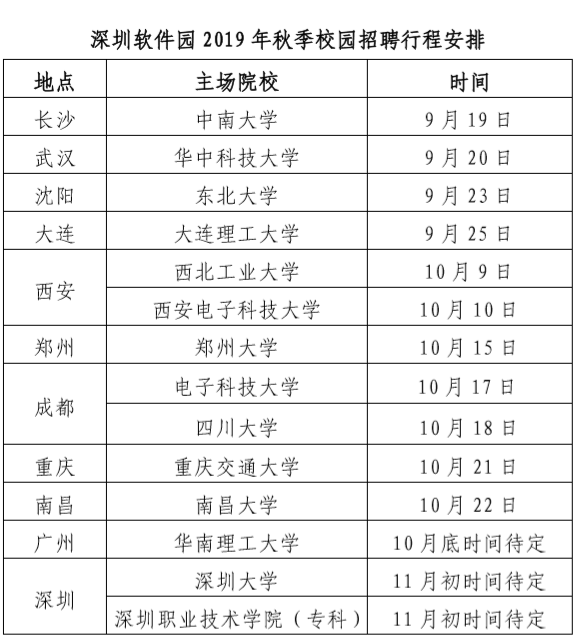 为促进深圳市高新科技产业与国内高校的合作,增强企业科技人才实力,助力深圳建设“社会主义先行示范区”,帮助企业招聘全国优秀大学毕业生,深圳市科技创新委员会将组织深圳信息科技企业到全国各重点高校进行专场校园招聘。“深圳软件园2019年秋季大学校园招聘行”由市科创委直属事业单位深圳软件园管理中心牵头组织深圳企业到西安、成都、重庆、沈阳、大连、武汉、南昌、郑州、长沙、广州、深圳等多所高校进行组团招聘,主要面向软件、计算机、数据科学、信息安全、通信技术、自控等相关专业。活动免费,请各企业积极参加。此次校园招聘行程安排如下: