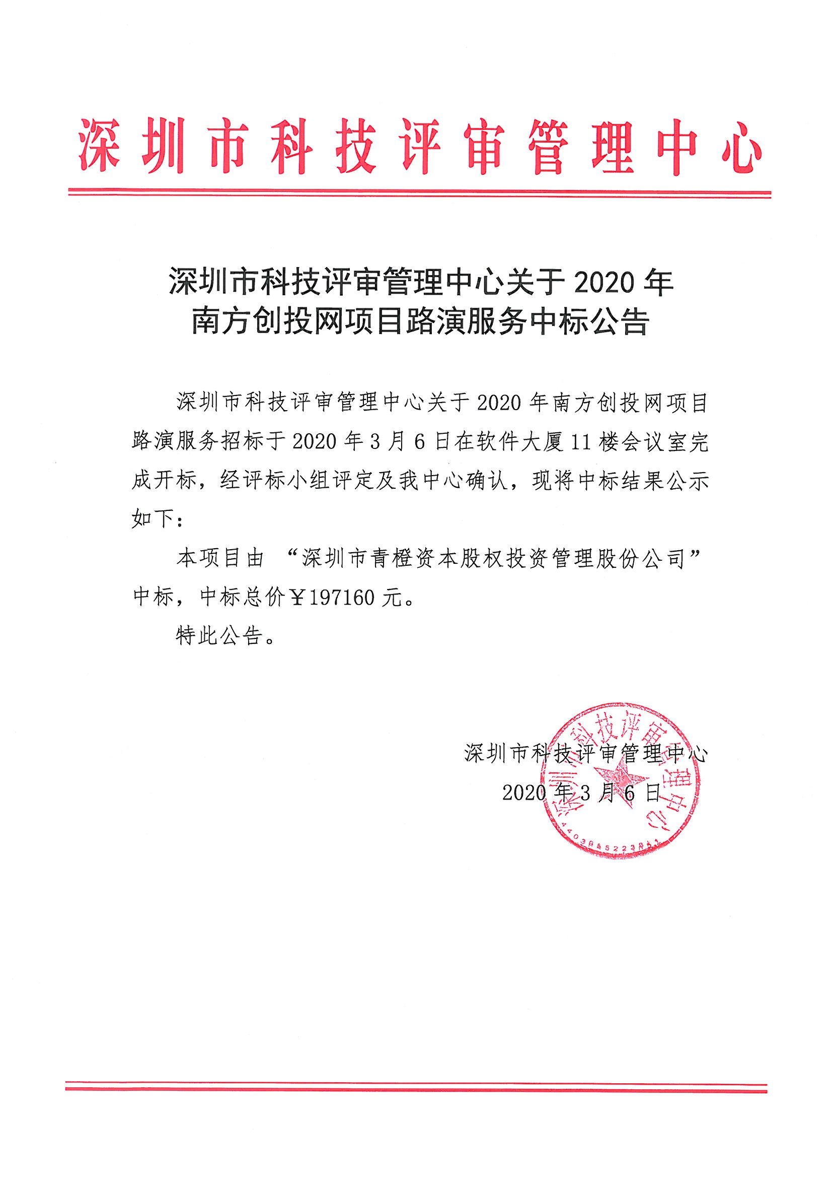 深圳市科技评审管理中心关于2020年南方创投网项目路演服务中标公告