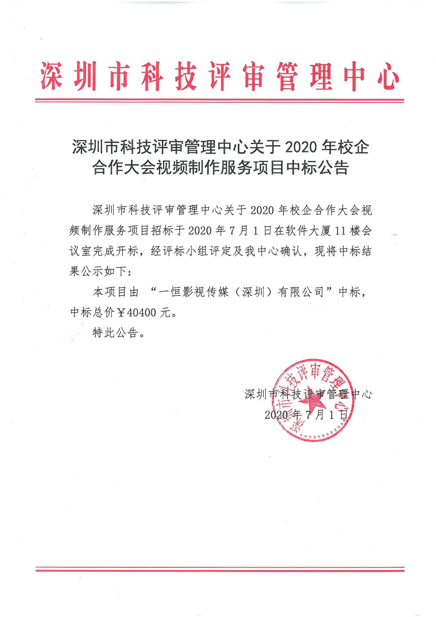 深圳市科技评审管理中心关于2020年校企合作大会视频制作服务项目中标公告