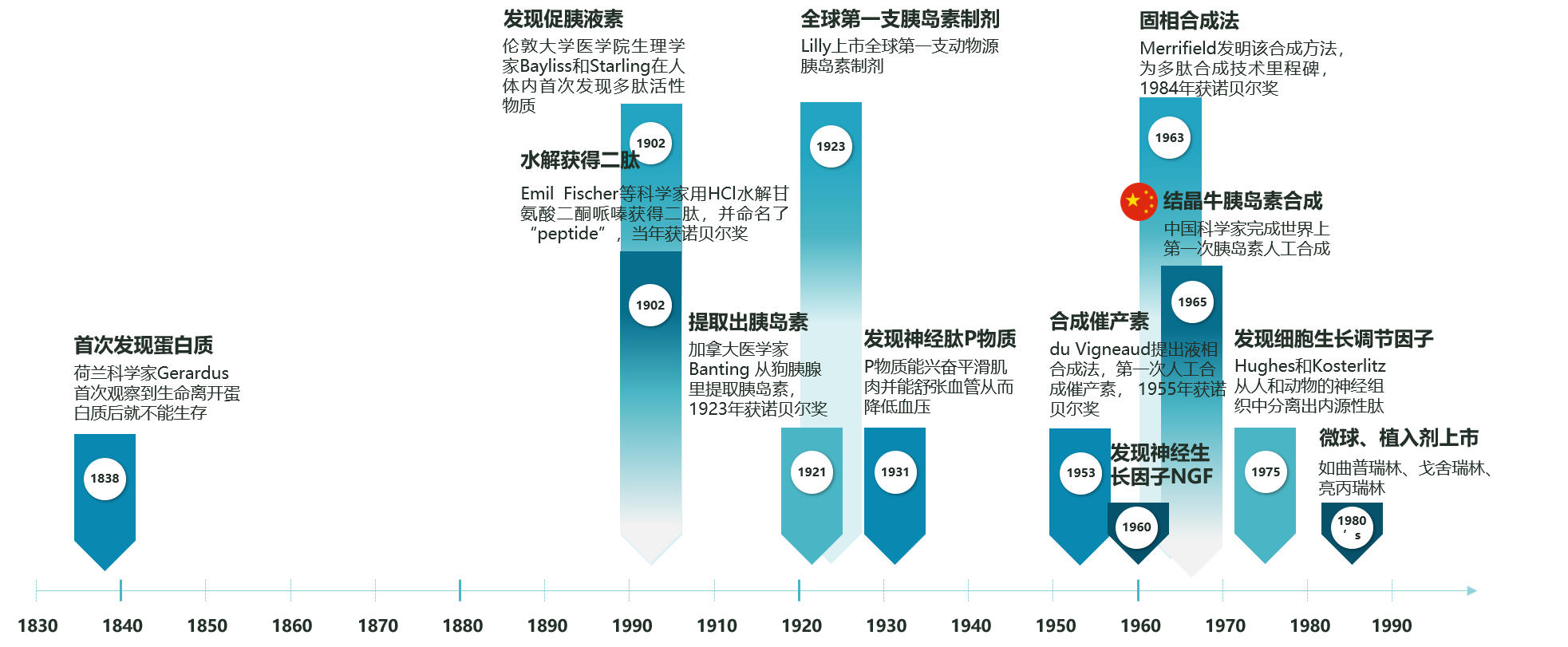 多肽药物的发展历程约一百年,并以胰岛素的提取,催产素的合成,固相合成方法的发明,中国结晶牛胰岛素合成,微球和植入剂的上市等为标志性事件。