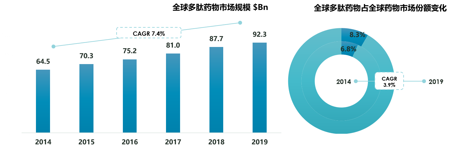 全球多肽行业自胰岛素兴起,由欧美三家最早制备胰岛素的企业驱动,他们是Lilly(美国),Hoechst AG(德国)和Novo Nordisk(丹麦);其他一些老牌企业,如Ferring,Bachem现已成为细分领域的标杆;中国虽然起步较晚但近30年发展活跃。目前,全球多肽药物市场规模从2016年的$75.2Bn已增长至2019年的$92.3Bn,虽然仅占全球医药的不到10%,但不乏甘精胰岛素、格拉替雷、利拉鲁肽,杜拉鲁肽等超过40亿甚至80亿美金的大品种。